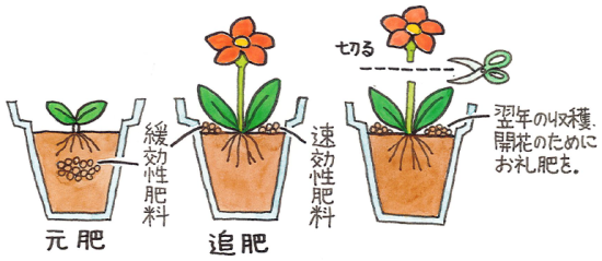 成長が活発な時期は栄養もたくさん必要ですので、施肥も忘れずに与えましょう。 与える植物と時期によりいろいろな施肥方法があります。 与えるときは肥料やけを防ぐため、根や茎に肥料が直接ふれないように注意してください。