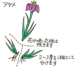 宿根草は地下部から発芽しますので、株分けをして植えかえれば長い間花を咲かせてくれます。 分けた株は放置せすに早めに植えましよう。更に、株の切りロには腐れ防止のため、粉末の殺菌剤をまぶします。植える前の土には石灰(約800g/坪)をまき、30〜50cmほど耕し、堆肥、鴇ふん、配合肥料などの元肥を十分与えます。 すぐ植えない場合は、士をよく落とし、陰干ししてから土中に埋めて貯蔵します。